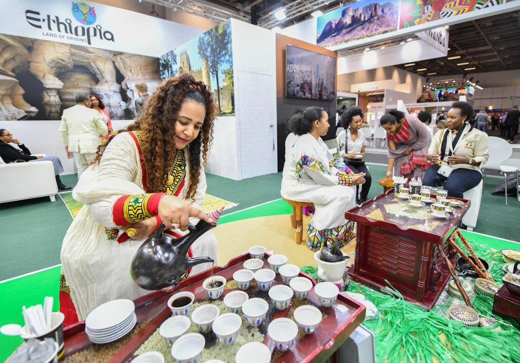 3月5日,在德国柏林举行的柏林国际旅游交易会埃塞俄比亚展区,工作人员为参观者制作咖啡。新华社记者任鹏飞摄