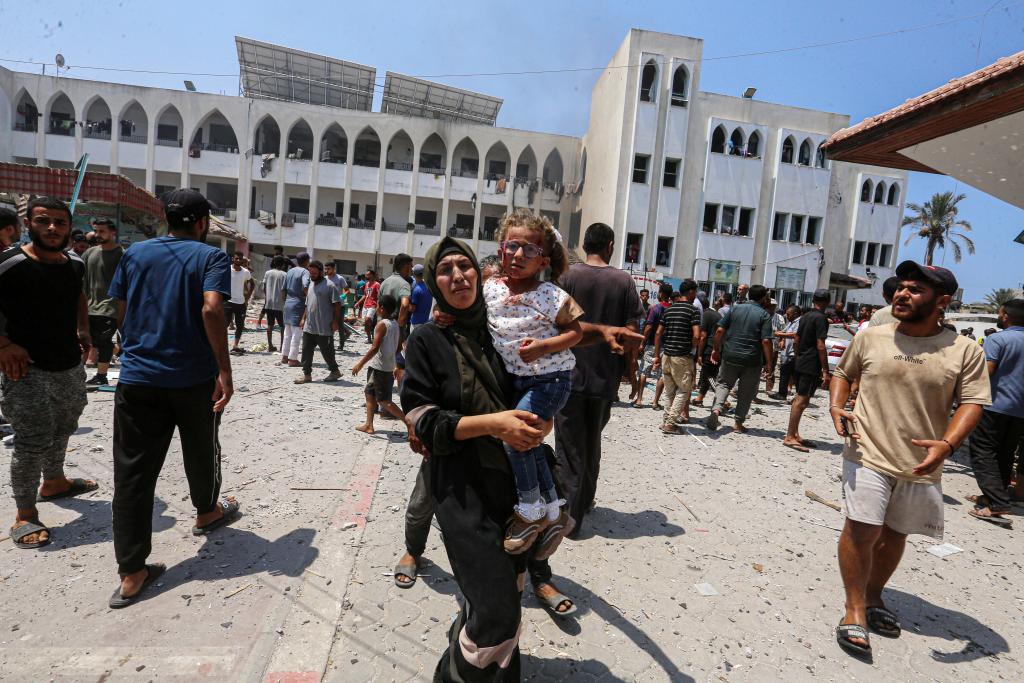 7月27日,在加沙地带中部城市代尔拜拉赫,一名妇女抱着一名受伤的儿童。新华社发(里泽克·阿卜杜勒贾瓦德摄)