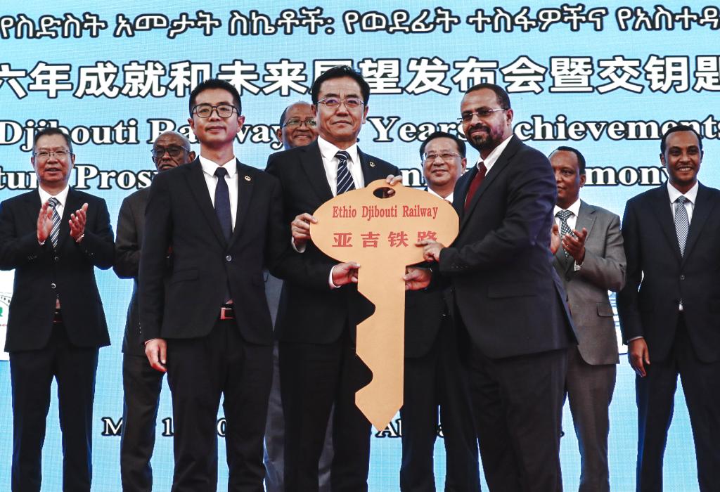 5月10日,在埃塞俄比亚首都亚的斯亚贝巴拉布火车站,亚吉铁路中方联营公司负责人与当地业主负责人举行“交钥匙”仪式。新华社记者刘方强摄