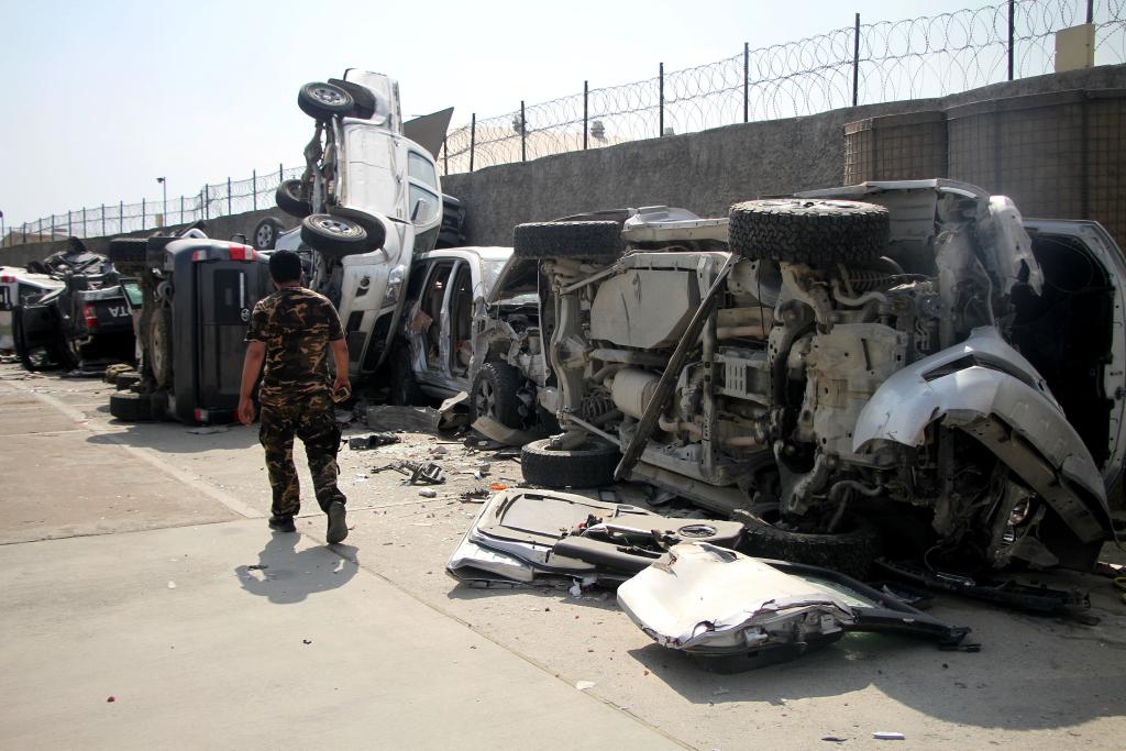 2021年9月20日,在阿富汗喀布尔机场,一名塔利班人员走过损毁的汽车。新华社发(塞夫拉赫曼·萨菲摄)
