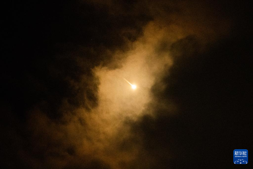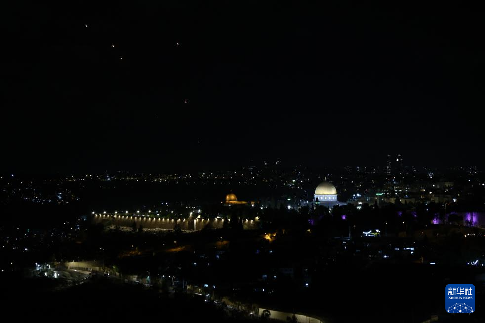 10月1日,以军防空系统拦截的发射物从耶路撒冷上空飞过。新华社发(贾马尔·阿瓦德摄)