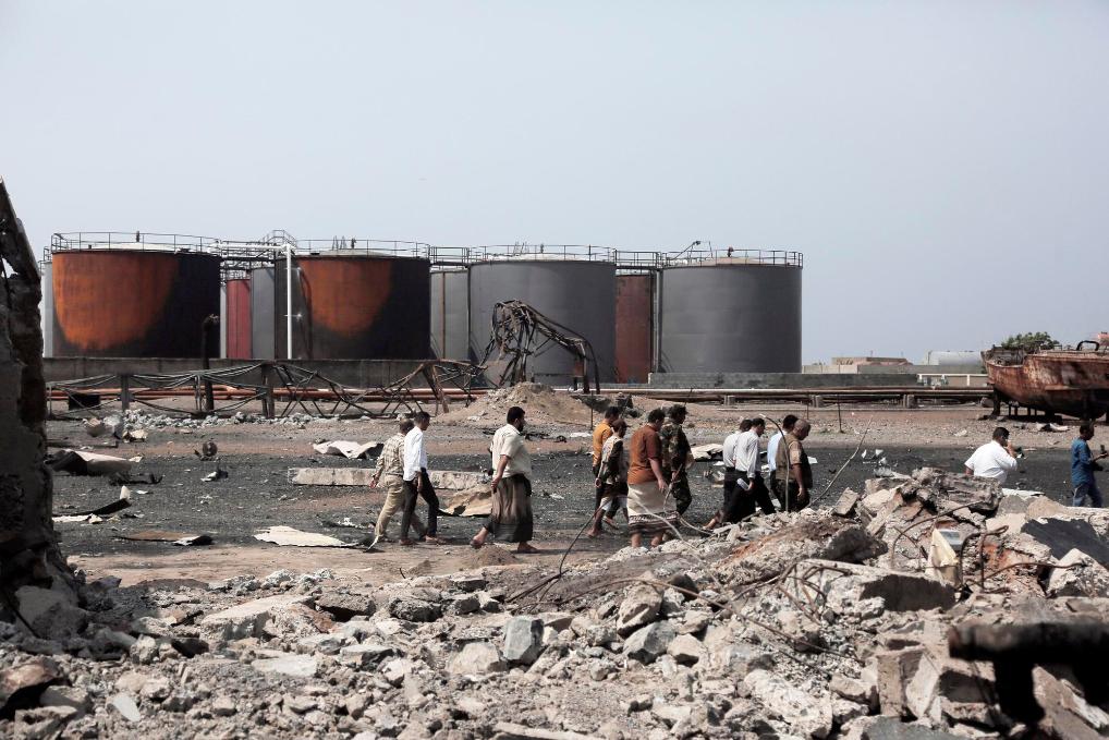 9月30日,在也门荷台达省荷台达市,人们走过被空袭摧毁的荷台达港发电站。新华社发(穆罕默德·穆罕默德摄)