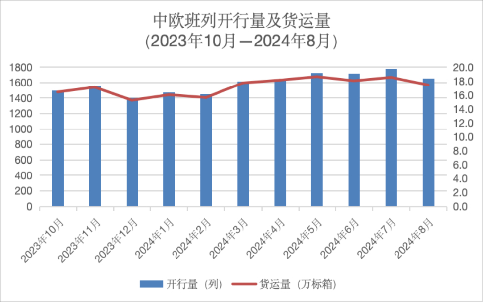 在跨里海国际运输走廊实现重大进展的推动下,中欧班列持续提质升级,一年来,开列车次、运力运量、覆盖范围等指标不断创下新佳绩。2024年1月至8月份,中欧班列累计开行13056列,发送货物139.9万标箱,同比分别增长12%、11%,其中8月份开行1653列,发送货物17.3万标箱。2024年以来,中欧班列已连续6个月单月开行数量突破1600列。截至2024年7月,中欧班列已通达欧洲25个国家224个城市,连接11个亚洲国家100多个城市,服务网络基本覆盖欧亚全境。中国境内已铺画时速120公里的图定中欧班列运行线91条,联通中国境内61个城市。中欧班列运输的货物品类达53大类5万余种,综合重箱率稳定在100%。2024年6月,中吉乌铁路项目三国政府间协定签署。这条铁路起自新疆喀什,经吉尔吉斯斯坦进入乌兹别克斯坦境内,未来可向西亚、南亚延伸,建成后不仅将极大促进三国互联互通,还将有效促进中亚、中欧铁路通道的联通发展。