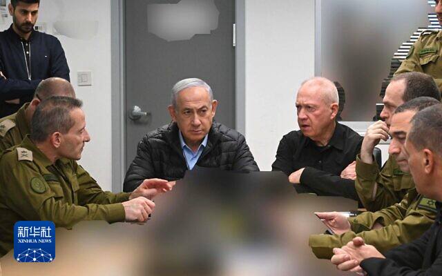 这张10月26日发布的照片显示,在对伊朗袭击期间,以色列总理内塔尼亚胡(中左)、国防部长加兰特(中右)以及国防军高级指挥人员坐在位于特拉维夫的国防军总部内。新华社发(以色列政府新闻办公室供图)
