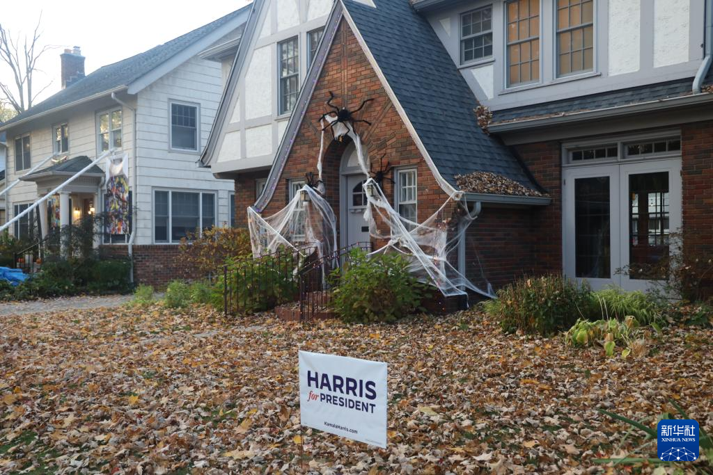 10月28日,民主党总统候选人哈里斯在美国密歇根州安阿伯举行竞选集会,这是集会地点附近一处民居前布置的支持哈里斯的标牌。新华社记者 徐剑梅 摄