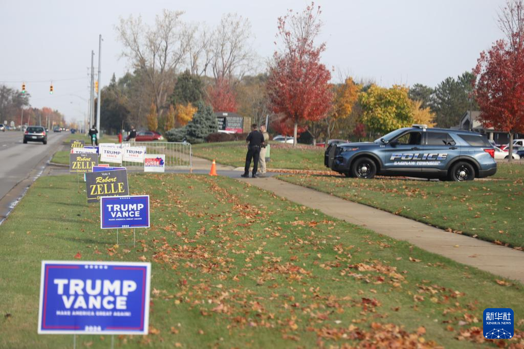 10月29日,共和党副总统候选人万斯在美国密歇根州萨吉诺镇举行竞选集会,集会地点附近插了许多支持特朗普和万斯的标牌。新华社记者 徐剑梅 摄
