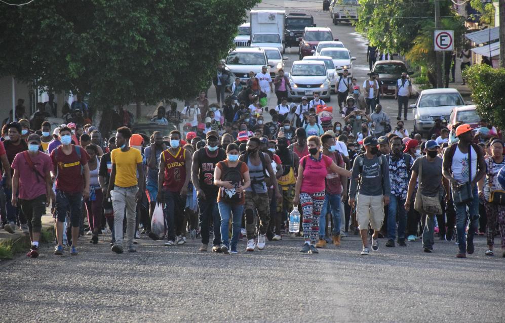 这是2021年9月4日,在墨西哥恰帕斯州塔帕丘拉,“移民大篷车”队伍向美国进发。新华社发(达米安·桑切斯摄)