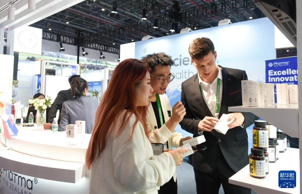 11月6日,参会者在第七届进博会食品及农产品展区了解新西兰深海鱼油等膳食添加剂产品。