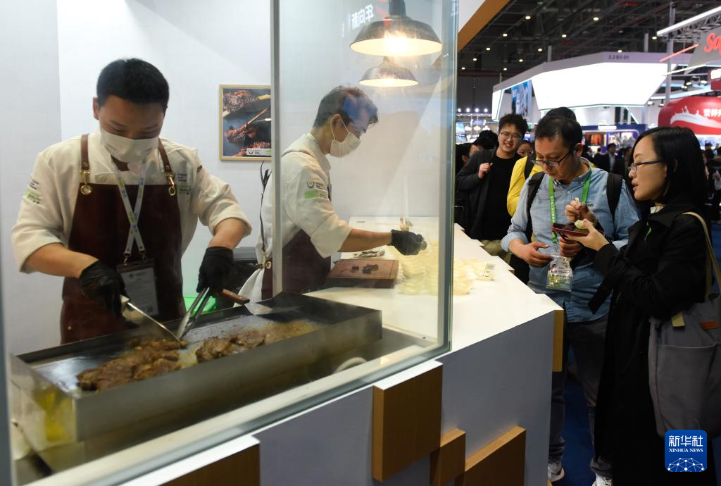 11月6日,参会者在第七届进博会食品及农产品展区乌拉圭肉类展台品尝牛肉。