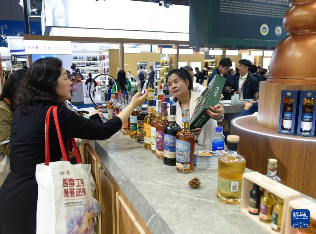 11月6日,参会者在第七届进博会食品及农产品展区了解爱尔兰烈酒。