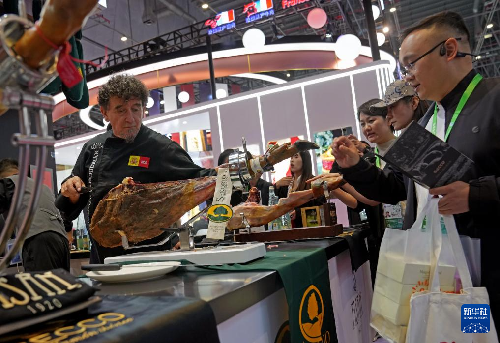 11月6日,参会者在第七届进博会食品及农产品展区卡斯特展台品尝西班牙火腿。