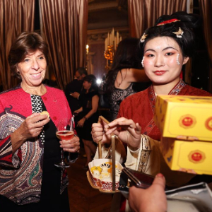 11月25日,在位于巴黎的法国外交部举行的LA LISTE国际美食榜单揭晓活动现场,法国前外长卡特琳·科隆纳(左)品尝来自中国北京的百年宫廷“仿膳”名点。