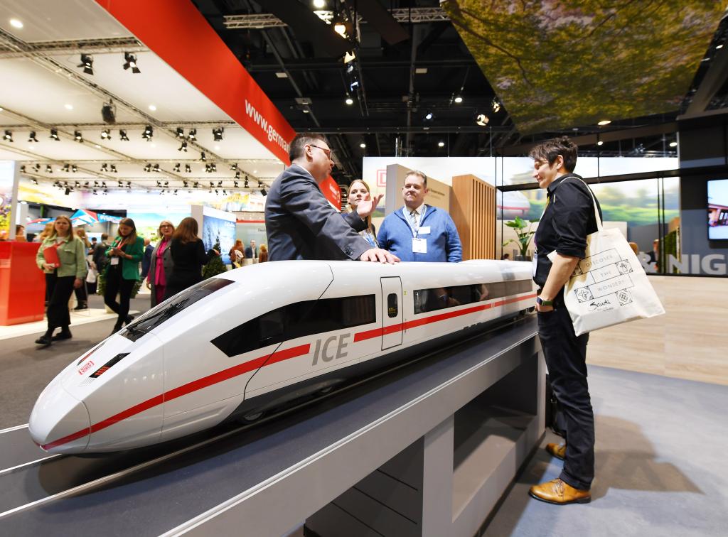 2023年3月7日,人们在德国柏林举行的柏林国际旅游交易会德国铁路公司展区交流。新华社记者任鹏飞摄