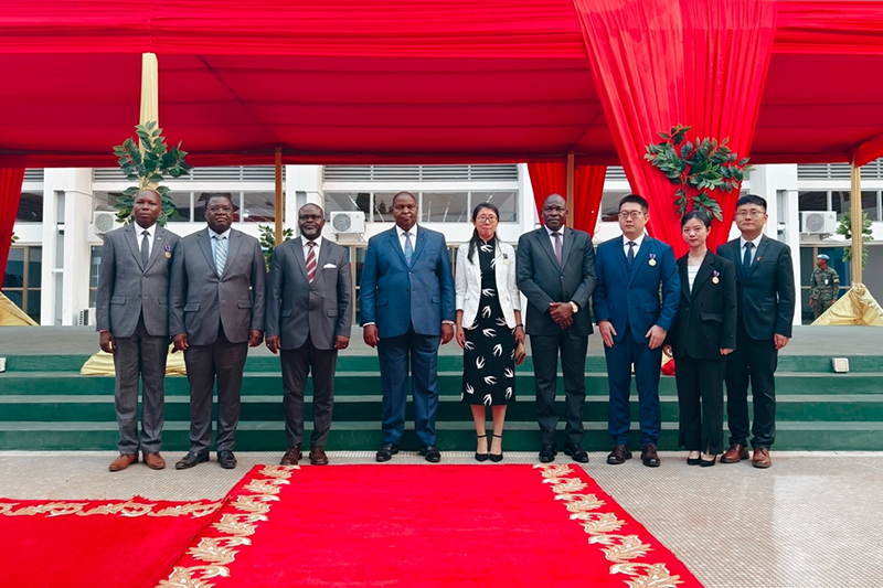 当天,班吉大学孔子学院中方院长马峥嵘、外方院长杜中兴,以及李阳、袁晓露和李肖天三位教师获得象征中非共和国教育与学术界最高荣誉的学术棕榈勋章。