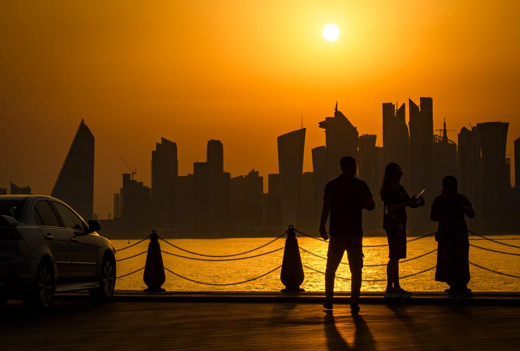 这是2023年7月6日在卡塔尔多哈拍摄的日落景象。新华社发,尼库摄