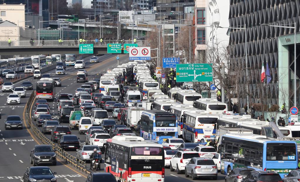 1月3日,大量警方车辆停在韩国首尔龙山区汉南洞的总统官邸附近。新华社记者姚琪琳摄