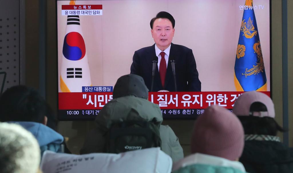2024年12月12日,在韩国首尔火车站,韩国民众观看总统尹锡悦对国民谈话的电视直播。新华社记者姚琪琳摄