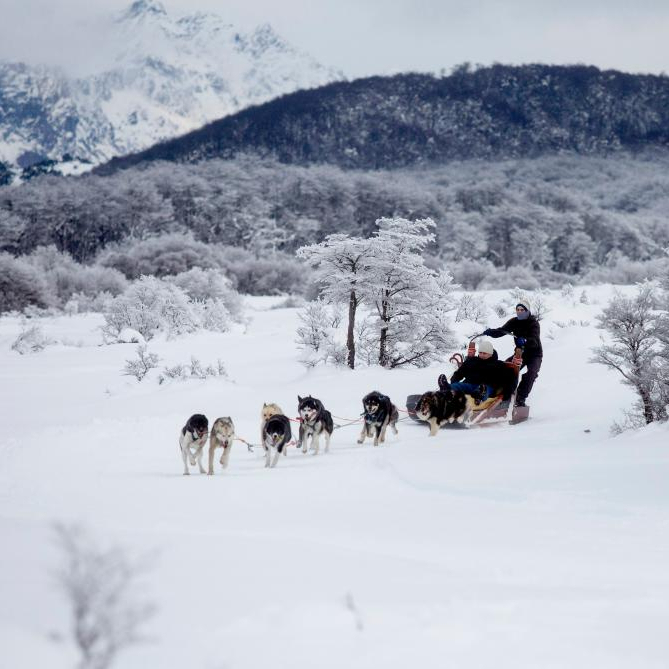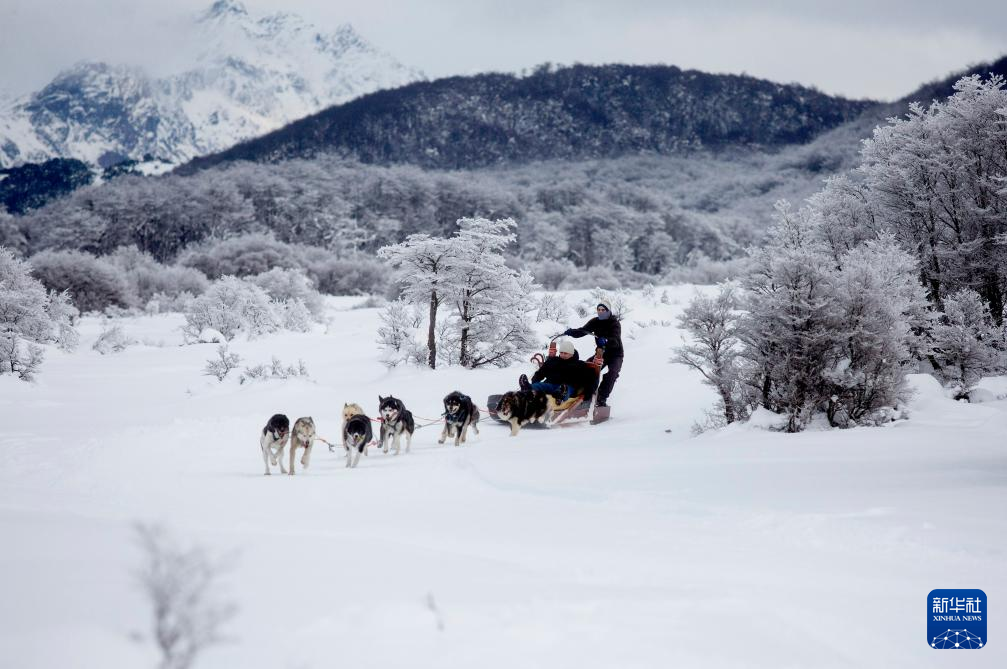 2018年7月8日,在阿根廷火地岛首府乌斯怀亚,游客体验狗拉雪橇。在南美大陆最南端的乌斯怀亚距南极洲只有800公里。新华社发(马丁·萨巴拉摄)