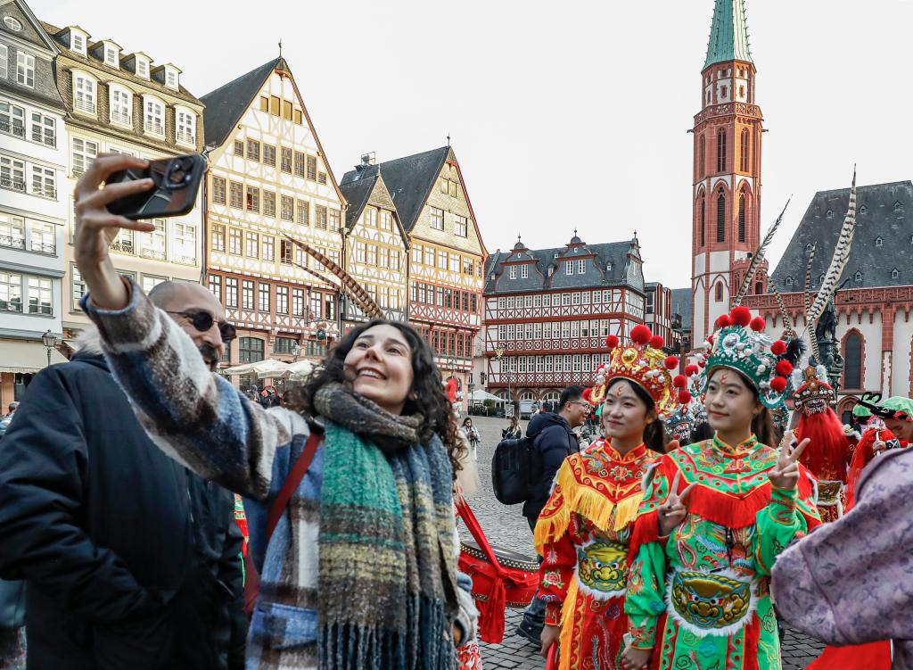 1月31日,在德国法兰克福,一名女子与潮汕英歌舞队演员在法兰克福市政厅前合影。新华社记者 张帆 摄