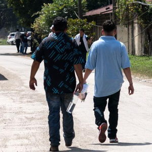 2月14日,在洪都拉斯西北部城市圣佩德罗苏拉,两名返乡移民步行离开返乡移民援助中心。新华社发(戴维 摄)