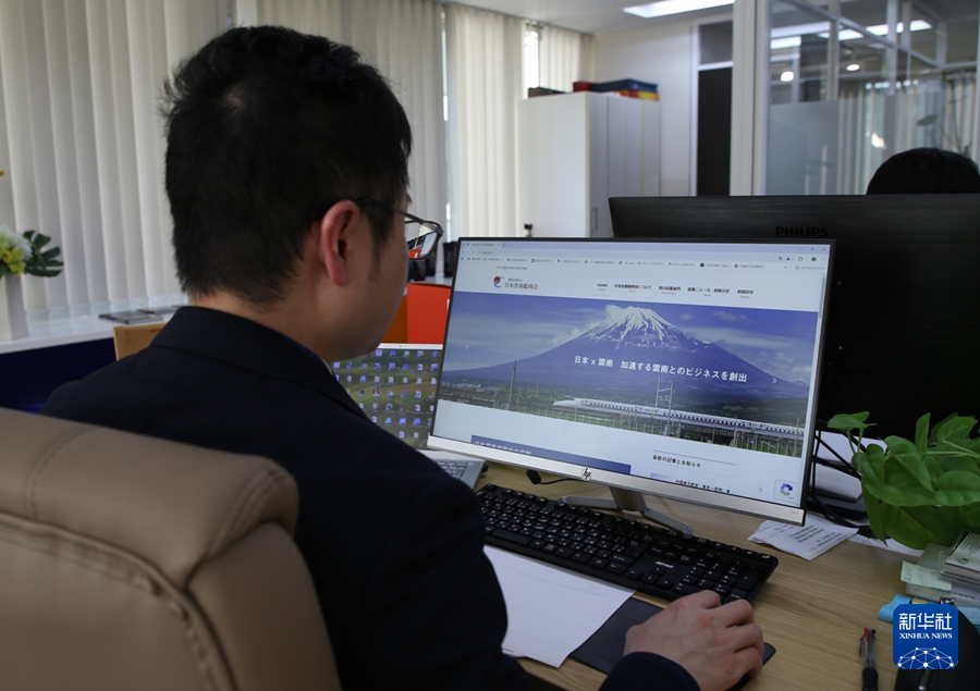 14日,日本云南总商会工作人员正在介绍该商会的日语官方网站。新华社记者岳晨星摄