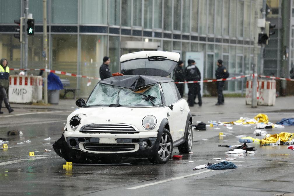 这是2月13日在德国慕尼黑的车辆冲撞人群事件现场拍摄的受损车辆。德国警方13日说,当天上午,德国慕尼黑城区发生车辆冲撞人群事件,数人受伤。新华社记者张帆摄