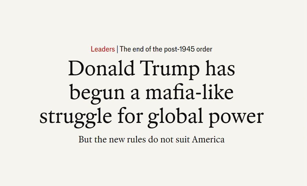 英国《经济学人》网站近期刊文称,美国总统特朗普已经开启一场黑手党式的全球权力争夺。1945年后建立的世界秩序正在加速撕裂。一个强权即公理、小国受欺负的世界正快速到来。文章摘要如下: