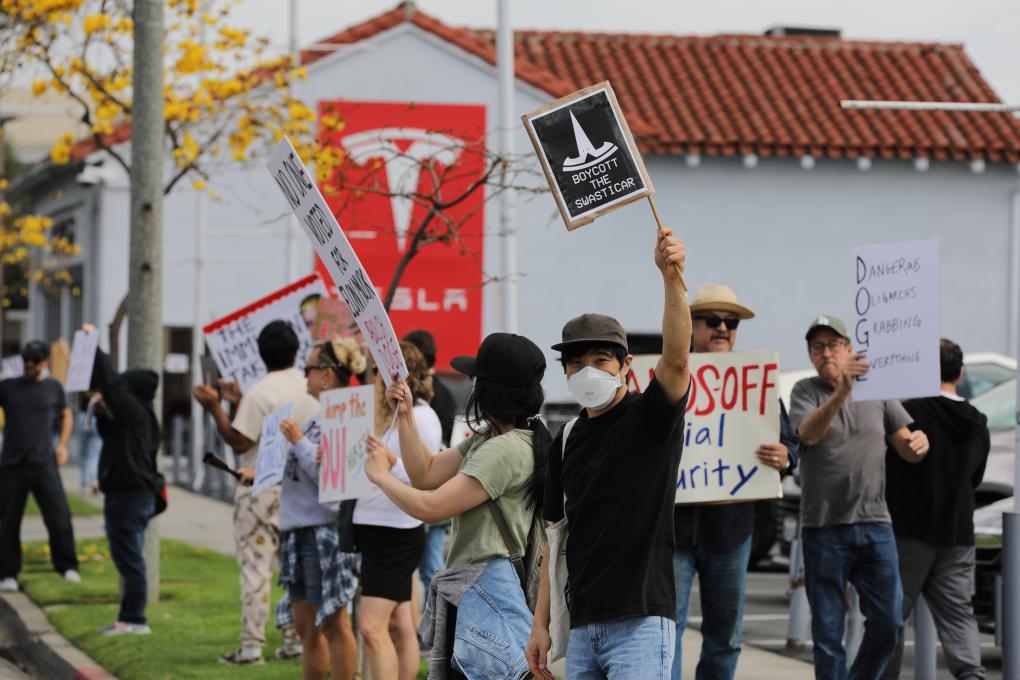 3月29日,示威者聚集在美国加利福尼亚州洛杉矶的一家特斯拉门店外。新华社发(邱晨摄)
