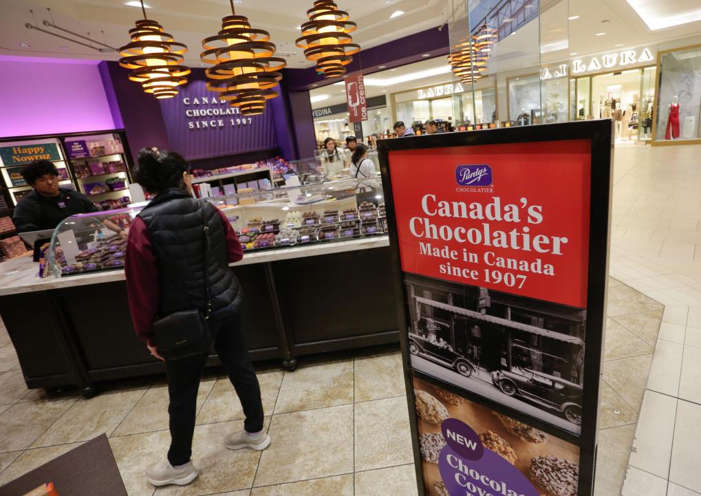 2月25日,加拿大温哥华一家巧克力店前摆放着印有“加拿大制造”的标牌。新华社发(梁森摄)
