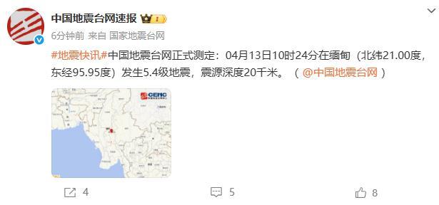 中国地震台网正式测定:4月13日10时24分在缅甸(北纬21.00度,东经95.95度)发生5.4级地震,震源深度20千米。