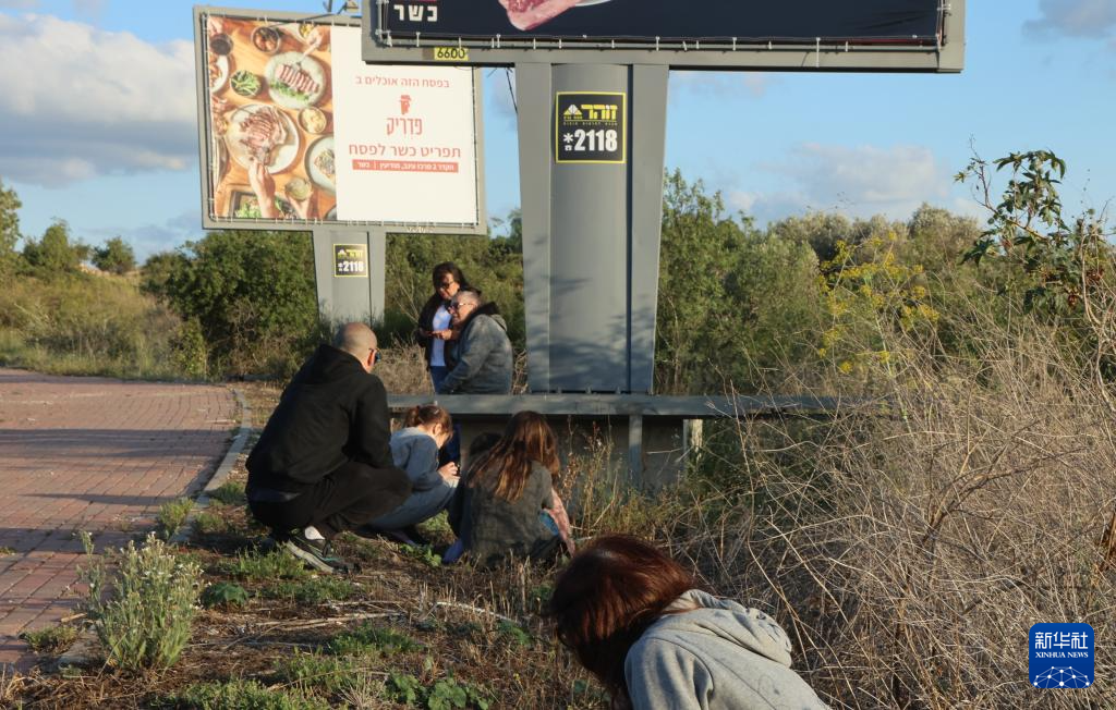 4月13日,在以色列莫迪因,人们在防空警报响起后蹲在路边避险。新华社发(吉尔·科恩·马根摄)