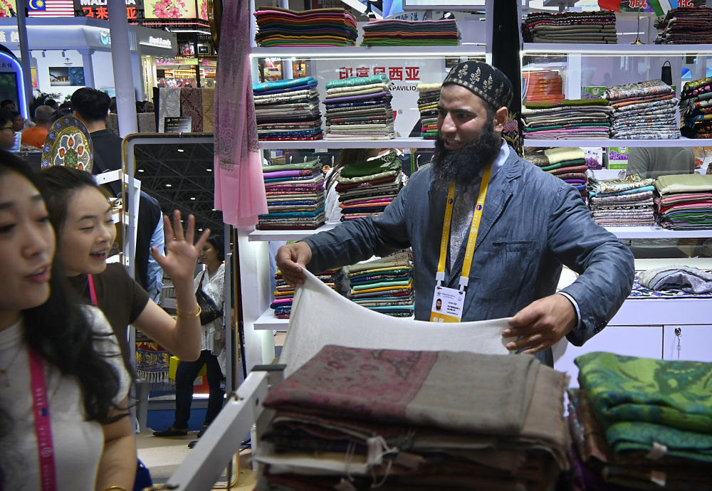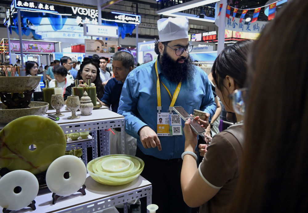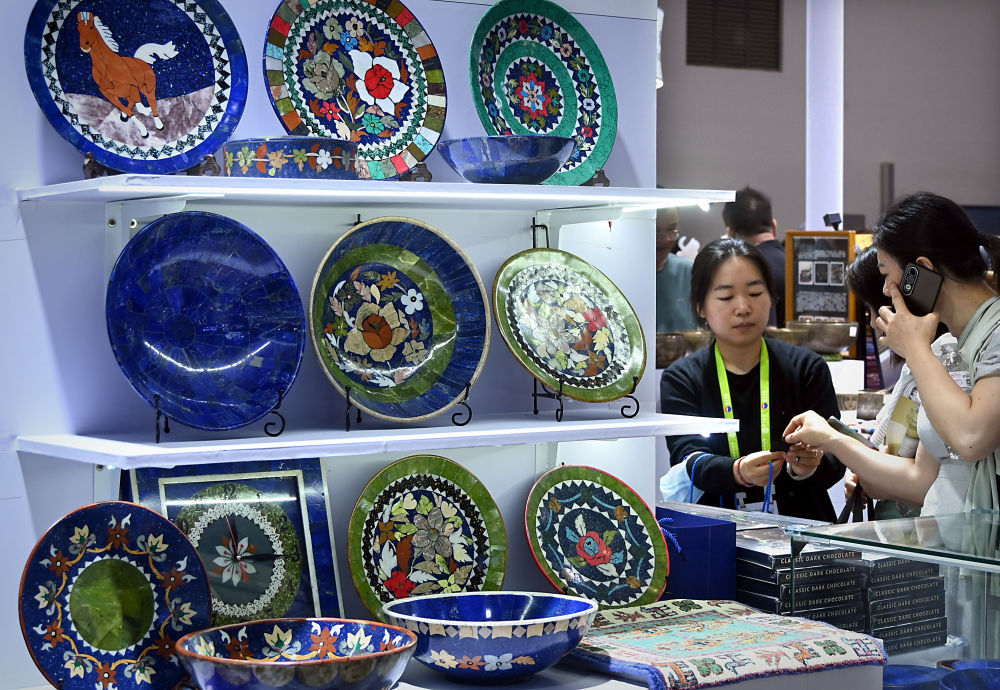 ↑4月16日,在消博会4号馆的巴基斯坦展区,参展商在介绍玉石工艺品。王颂 摄