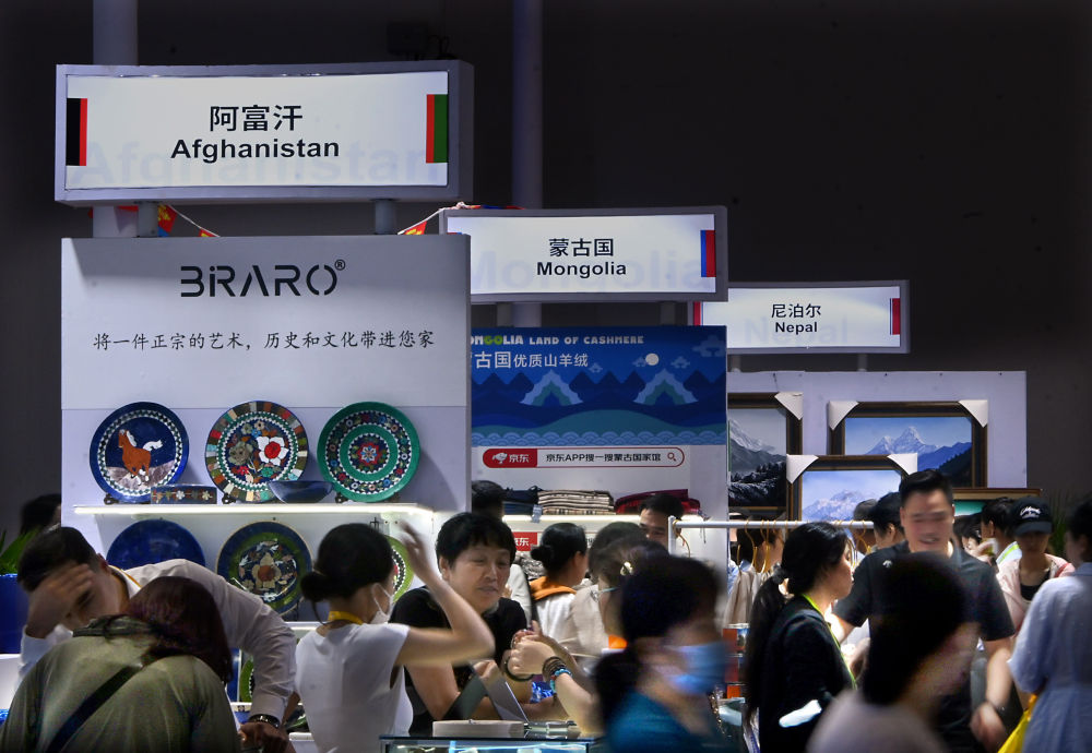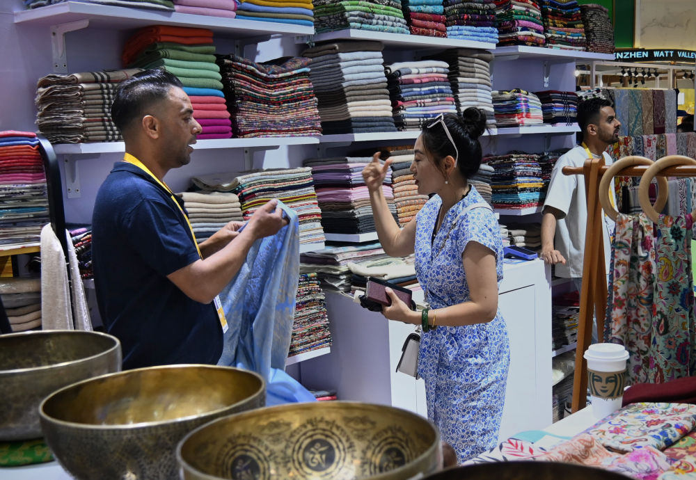 ↑4月16日拍摄的消博会4号馆的尼泊尔展区一角。王颂 摄