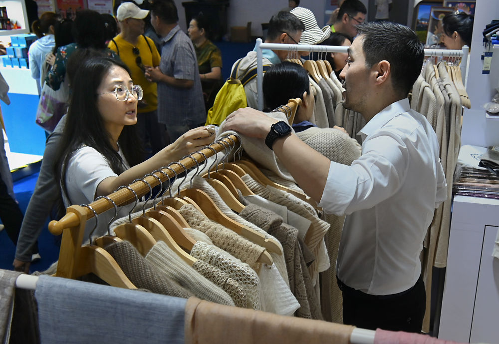 ↑4月16日,在消博会4号馆的蒙古国展区,参展商在向观众推介羊毛服装。王颂 摄