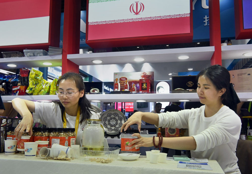↑4月16日,在消博会4号馆的伊朗展区,参展工作人员在布置展品。王颂 摄