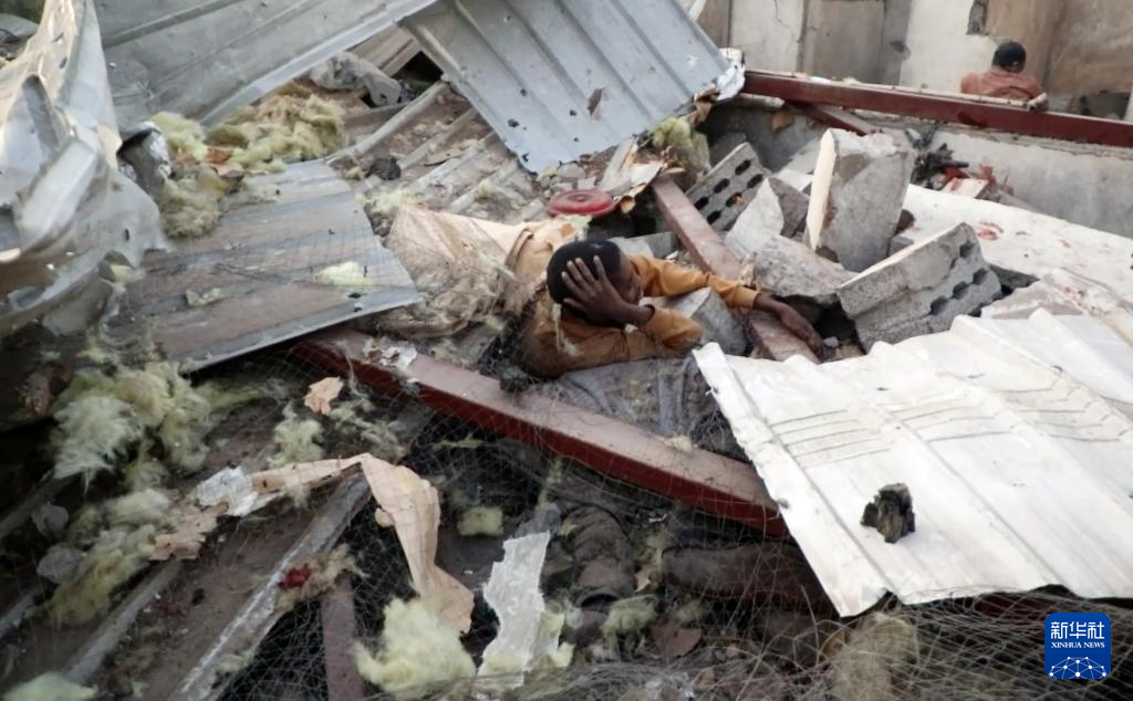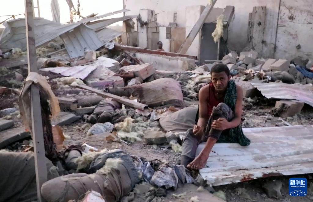 这张4月28日拍摄的视频截图显示,在也门萨达省一个拘留中心,伤者在废墟中等待救援。新华社发(胡塞媒体中心供图)