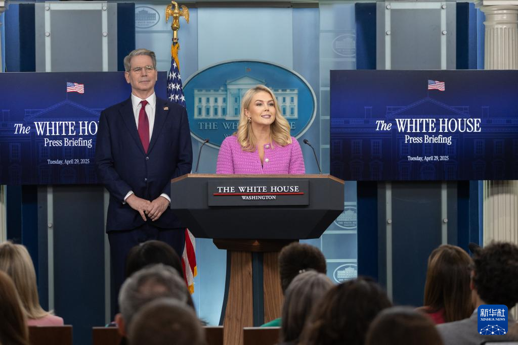 4月29日,美国白宫新闻秘书卡罗琳·莱维特(右)与美国财政部长斯科特·贝森特在华盛顿白宫出席记者会。新华社记者 胡友松 摄