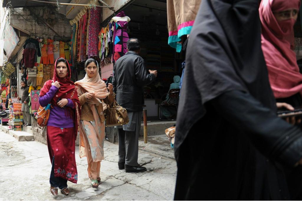 2014年3月16日,在巴控克什米尔地区首府穆扎法拉巴德,两名妇女在街道穿行。新华社记者黄宗治摄