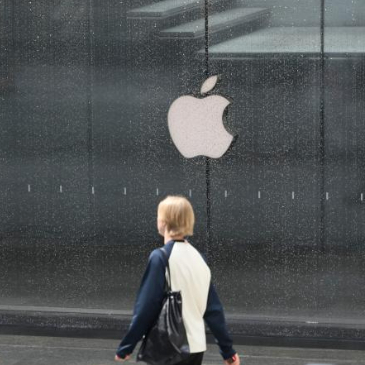 人们在意大利米兰的一家苹果门店前休息(4月12日摄)。