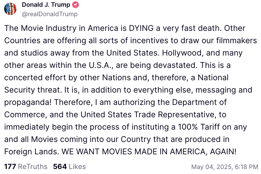特朗普说,他将授权美国商务部和美国贸易代表立即启动程序,对所有进入美国、在外国制作的电影征收100%关税,希望“再次拥有美国制作的电影”。