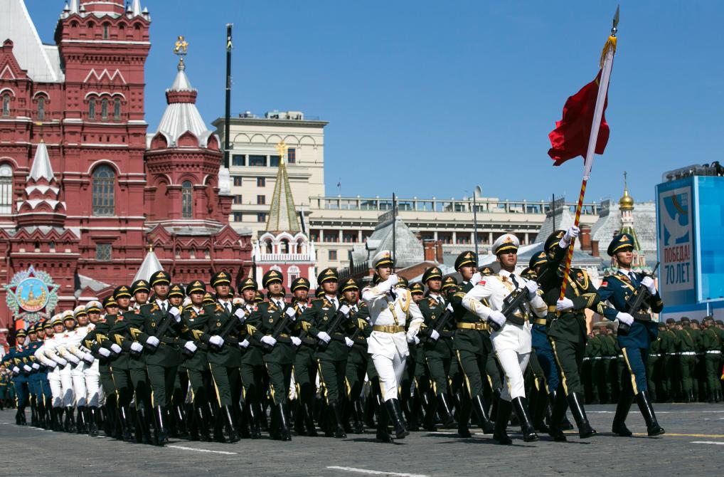 2015年5月7日,在俄罗斯首都莫斯科,中国人民解放军三军仪仗队在彩排中列队行进。当日,俄罗斯在首都莫斯科的红场举行纪念卫国战争胜利70周年红场阅兵式总彩排。新华社记者马占成摄