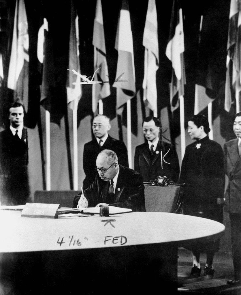1945年6月26日上午10时许,旧金山退伍军人纪念堂,8名中国代表先后在《联合国宪章》上庄重写下自己的名字。中国成为当时第一个在《联合国宪章》上签字的国家。