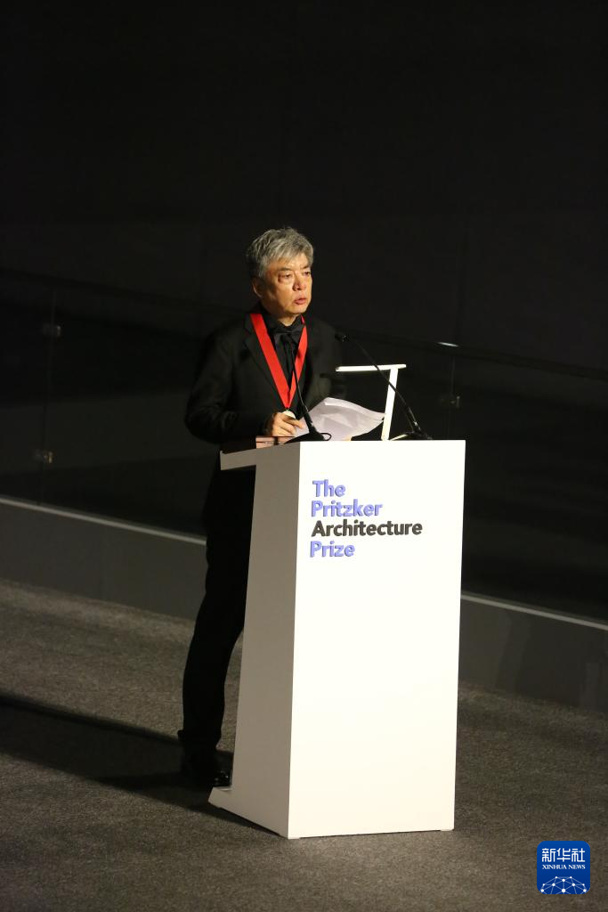 5月5日,在阿联酋阿布扎比卢浮宫,2025年普利兹克建筑奖得主、中国建筑师刘家琨在颁奖典礼上发表获奖感言。新华社记者 温新年 摄