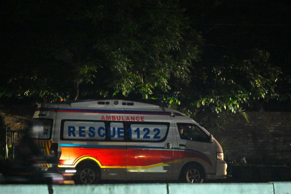 5月10日,一辆救护车抵达巴基斯坦拉瓦尔品第的努尔·汗空军基地附近。新华社发(艾哈迈德·卡迈勒摄)