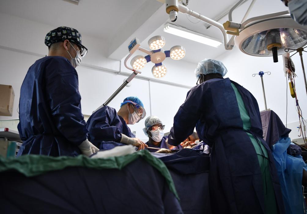 2025年4月29日,在位于几内亚首都科纳克里的中几友好医院,中方医生与当地医生为患者做手术。新华社记者韩旭摄