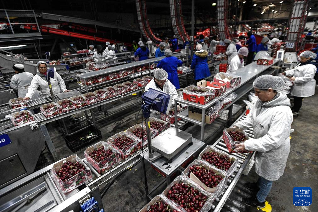 2024年12月13日,在智利莫斯塔萨尔的一座吉制公司工厂,工作人员处理车厘子。吉制公司2006年起开始向中国出口车厘子。新华社发(豪尔赫·比列加斯摄)