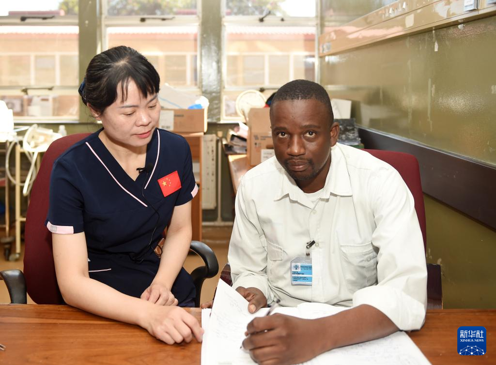 5月6日,在博茨瓦纳首都哈博罗内的玛丽娜公主医院,第17批援博医疗队哈博罗内分队队员、福建省妇幼保健院护士林琴(右)与当地同事交流。 新华社发(策基索·特巴洛 摄)