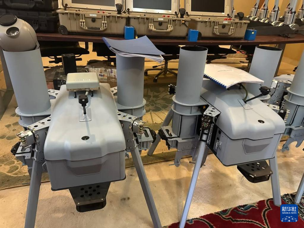 这是5月20日在苏丹首都圈恩图曼市南部萨勒哈地区拍摄的苏丹武装部队缴获的无人机系统组件。