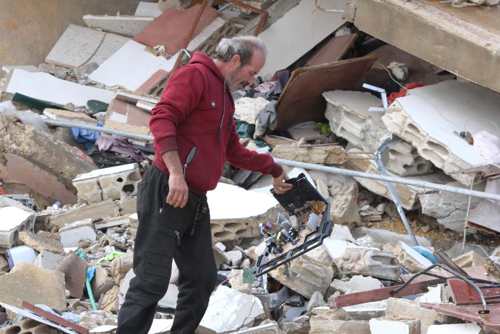2月21日,在黎巴嫩南部的迈斯杰贝勒,一名返回家园的男子查看废墟中的物品。新华社发(塔希尔·阿布·哈姆丹摄)