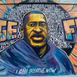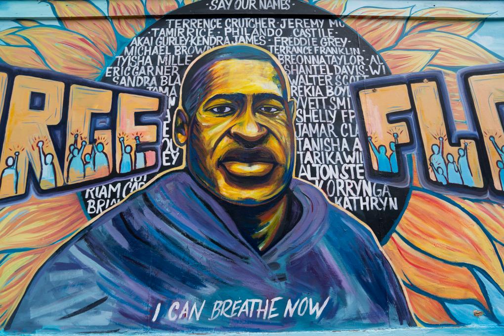 这是2022年5月22日在美国明尼苏达州明尼阿波利斯市拍摄的弗洛伊德广场上的纪念画。新华社记者 刘杰 摄